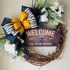 Each wreath is handmade and gently decorated. Perfect for your front door or as a wall decoration. Custom orders always welcome! This KC Chiefs wreath is made of high quality faux florals, wood sign & ribbon created on an 18 inch grapevine wreath frame. The overall decorated size is approximately 22 inches tip to tip.