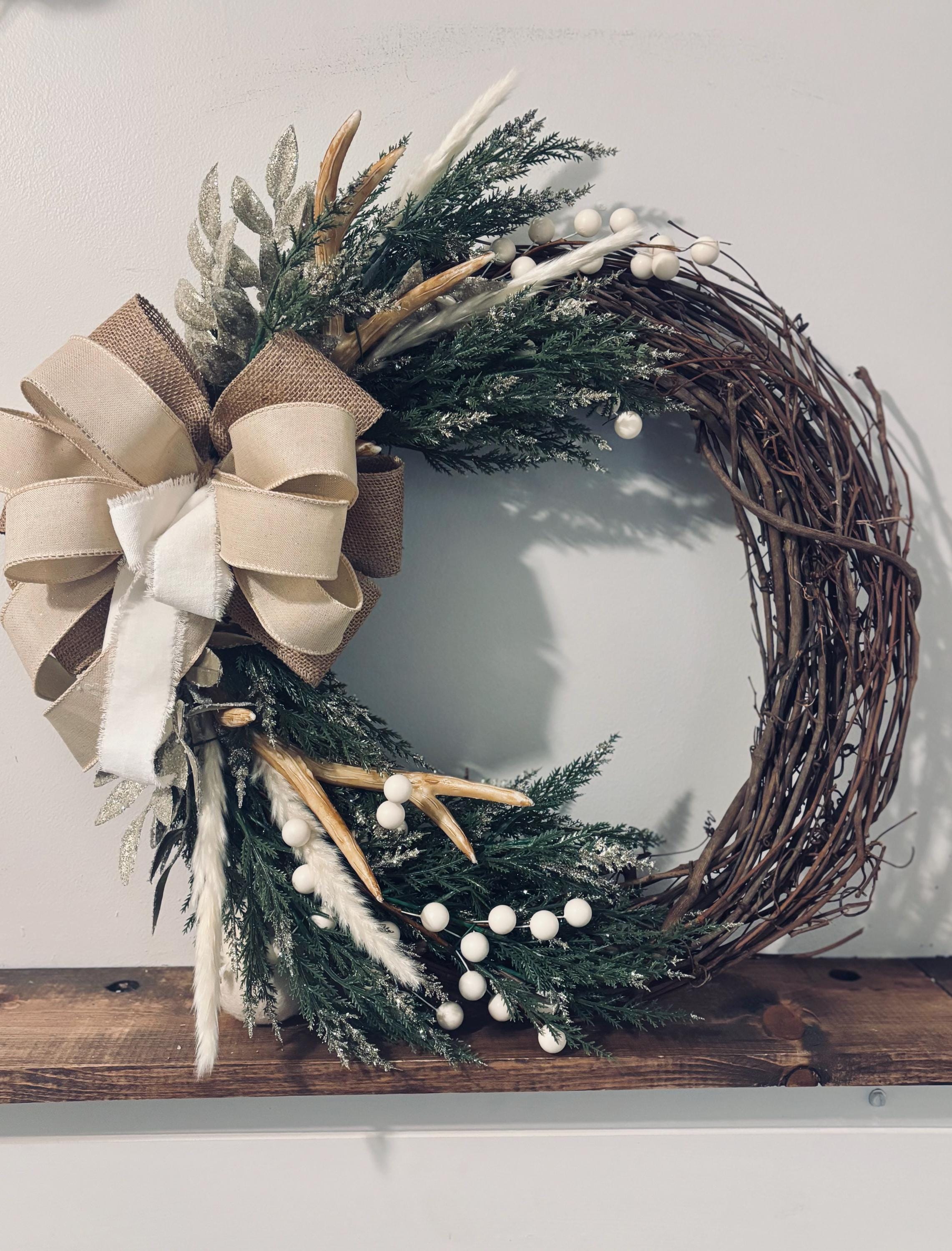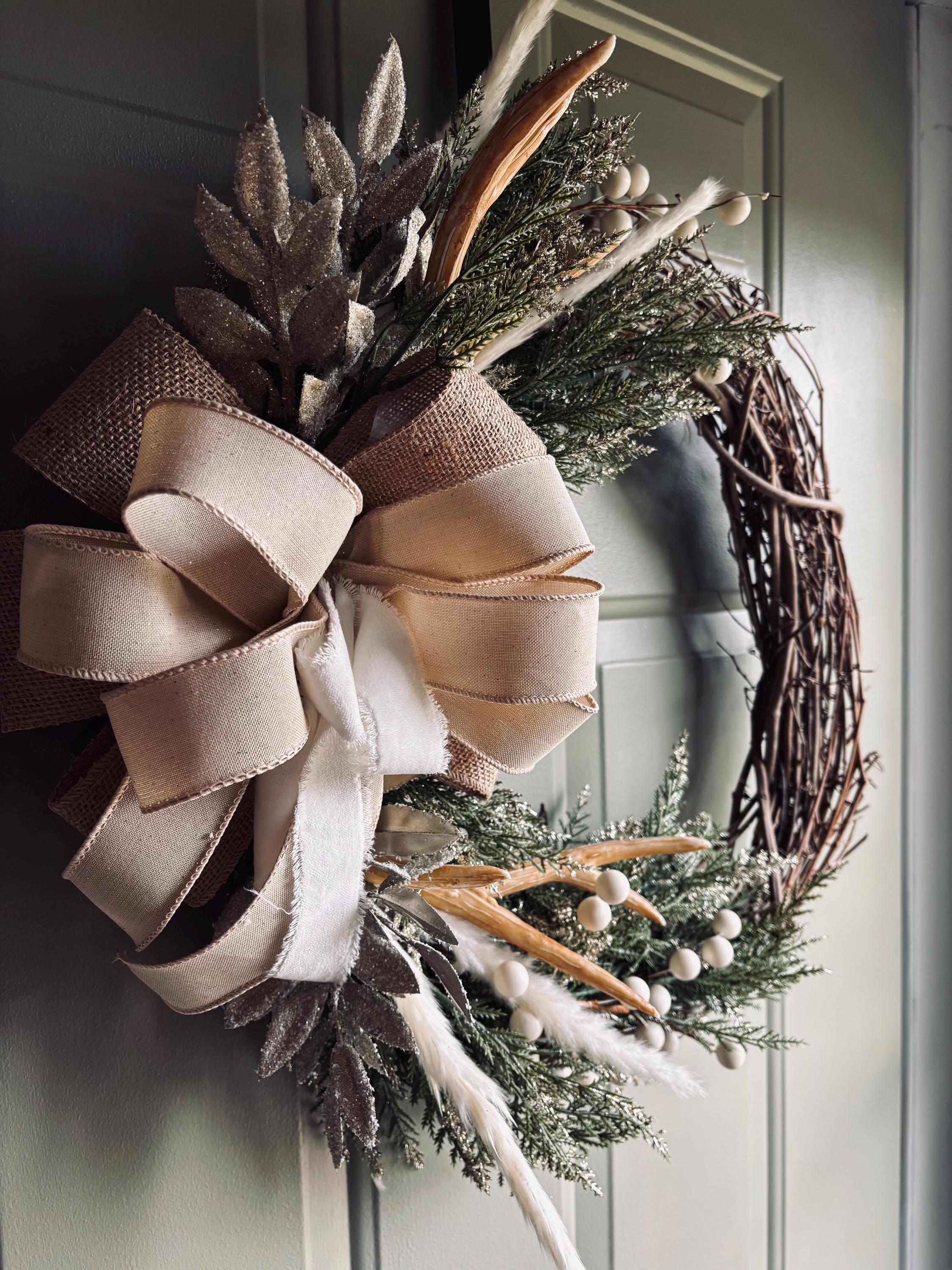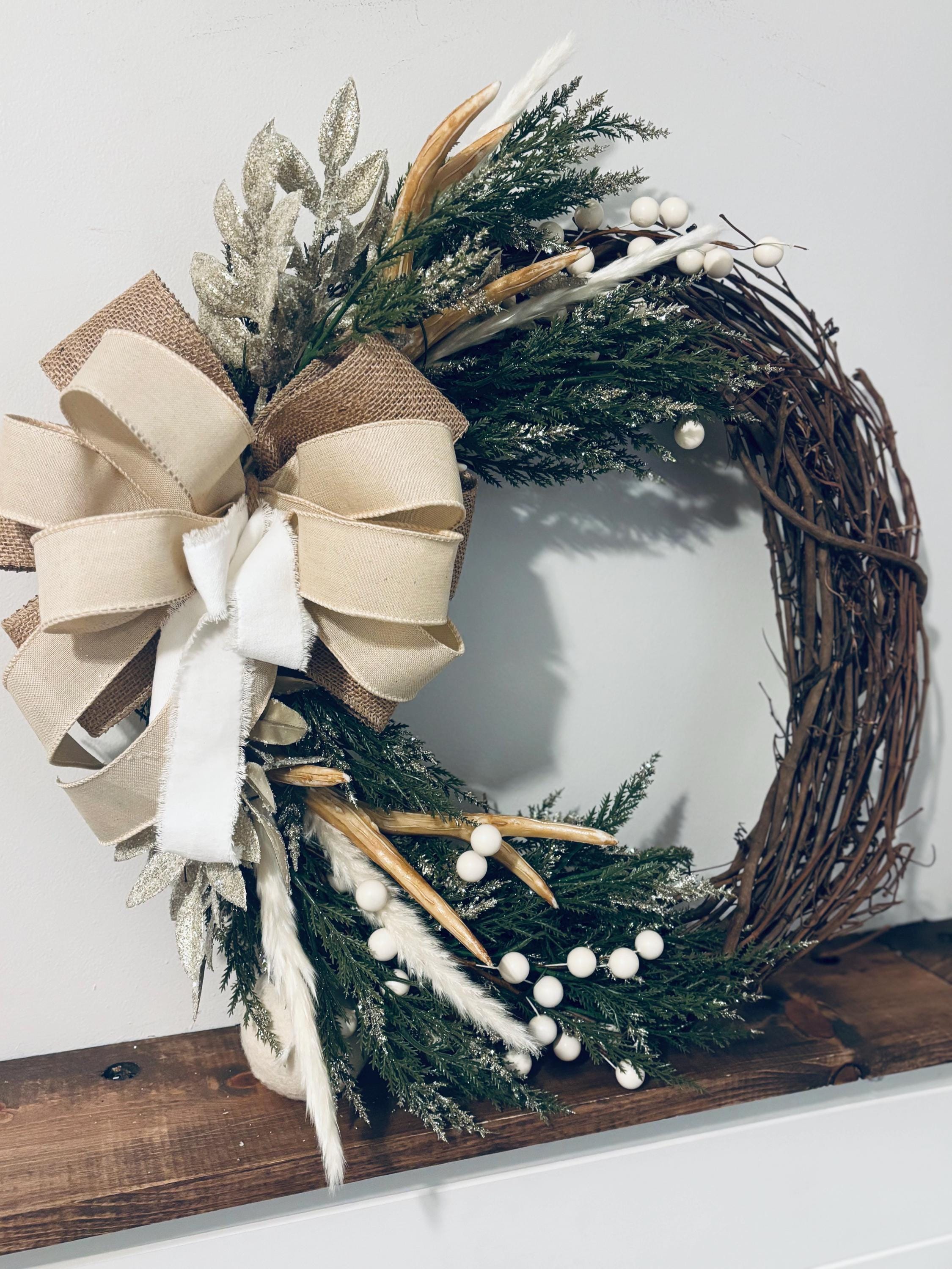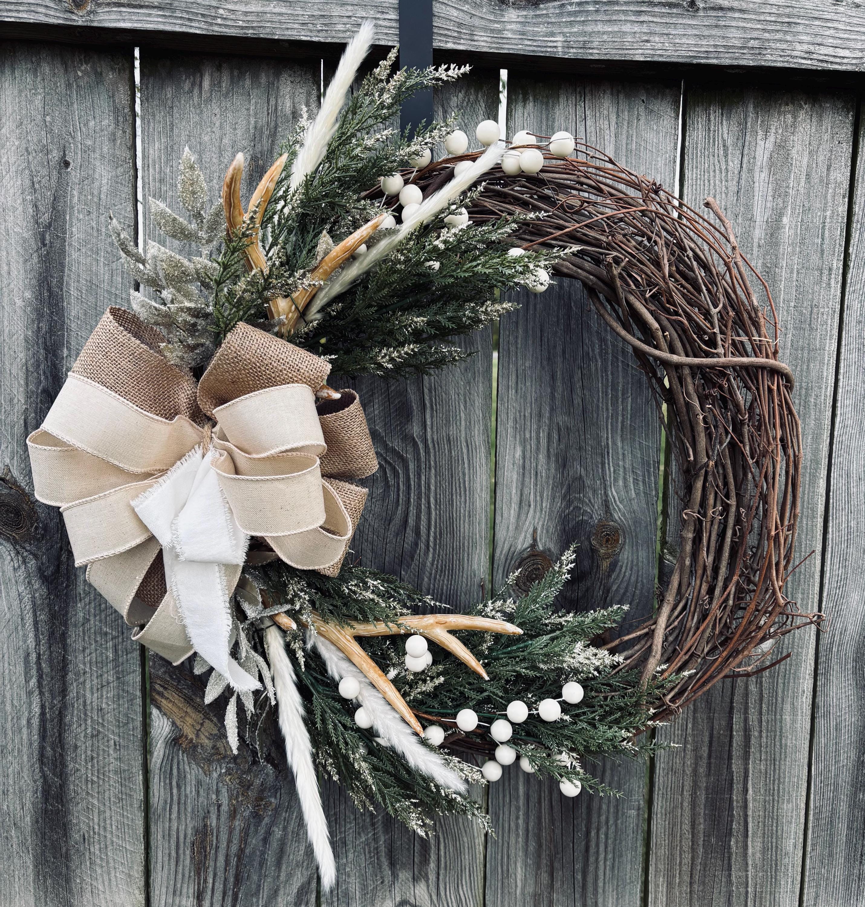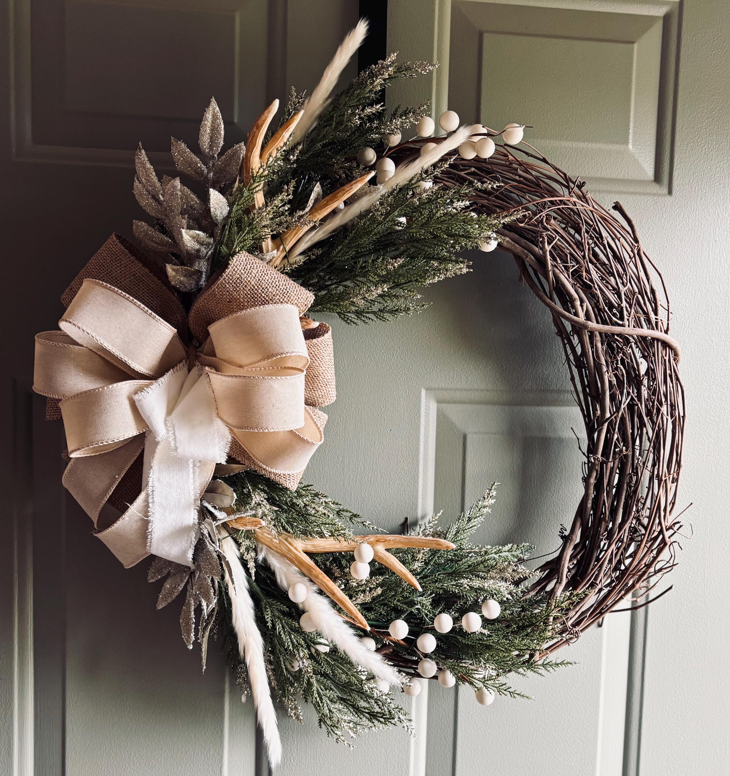 Each wreath is handmade and gently decorated. Perfect for your front door or as a wall decoration. Custom orders always welcome! This neutral wibter wreath is made of high quality faux florals created on an 18 inch grapevine wreath frame. The overall decorated size is approximately 22 inches tip to tip.